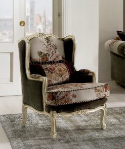 Кресло, декорированное резьбой. Обивка — ткань, наполнение — полиуретан. Возможны различные варианты обивки