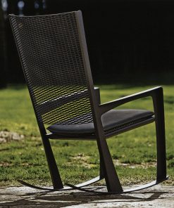 Кресло-качалка с решётчатой спинкой и сиденьем. Выполнена из металла. Возможны другие варианты отделки. Подушка для сиденья заказывается дополнительно
