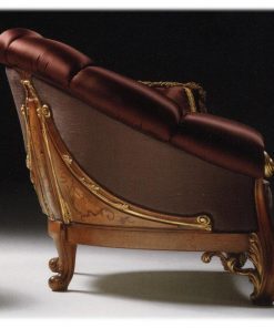 Кресло, спинка плавно переходит в подлокотники. Наполнение — полиуретан. Декорировано резными элементами ручной работы. Возможны другие варианты отделки и обивки.