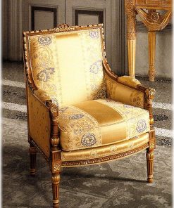 Кресло, подлокотники с мягкими накладками, декорировано резными элементами. Наполнение — полиуретан. Возможны другие варианты отделки и обивки. В дополнение можно заказать декоративные подушки