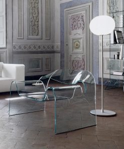 Кресло из изогнутого стекла толщиной 12 мм. Возможны другие варианты отделки.