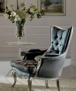 Кресло, декорированное резьбой. Структура — бук, наполнение — полиуретан. Возможны различные варианты отделки и обивки, в том числе выполнение в ткани клиента. Возможен вариант кресла без отделки капитоне