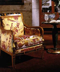 Кресло, жесткие подлокотники. Декорировано резными элементами. Наполнение — полиуретан. Возможны другие варианты обивки и отделки. В дополнение можно заказать декоративные подушки.