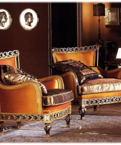 Кресло, декорированное резьбой. Наполнение — полиуретан. Возможны другие варианты отделки и обивки, в том числе выполнение в ткани клиента