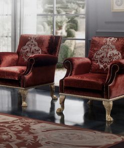 Обитое кресло с резными ножками. Возможны другие варианты отделки и обивки.