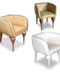 Кресло, спинка расположена на одном уровне с подлокотниками, фигурные ножки. Наполнение — полиуретан. Возможны другие варианты обивки и отделки