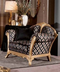 Кресло, декорированное резьбой. Обивка — ткань, наполнение — полиуретан. Возможны другие варианты отделки и обивки