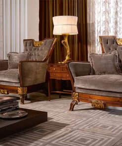 Кресло, декорированное резьбой. Обивка — ткань, наполнение — полиуретан. Возможны другие варианты отделки и обивки