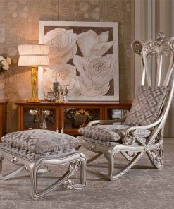 Кресло, декорированное резьбой. Обивка — ткань, наполнение — полиуретан. Возможен другой вариант отделки и обивки