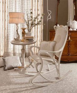 Мягкое кресло-качалка, декорированное резьбой. Обивка — ткань, наполнение — полиуретан. Возможен другой вариант отделки и обивки