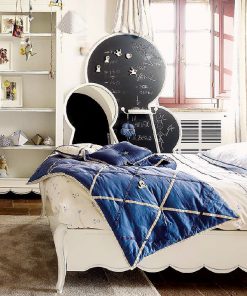 Односпальная кровать с обитым изголовьем. Украшена вышивкой. Возможны другие варианты отделки и обивки.
