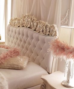 Двуспальная кровать с высоким мягким изголовьем, без изножья. Декорирована резными элементами. Возможны другие варианты отделки и обивки. Возможен вариант кровати с контейнером для белья.