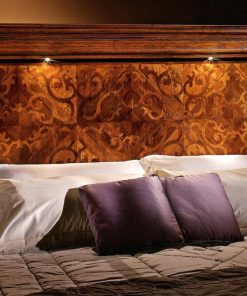 Двуспальная кровать с высоким жестким изголовьем и изножьем. Декорирована инкрустацией ручной работы. Возможны другие варианты отделки.