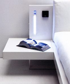 Двуспальная кровать с обитым изголовьем, со светодиодной подсветкой и прикроватными тумбочками разных размеров. Возможны другие варианты отделки и обивки.
