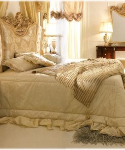 Двуспальная кровать с высоким мягким изголовьем, без изножья. Кровать декорирована резьбой ручной работы. Наполнение — полиуретан. Возможны другие варианты отделки и обивки.