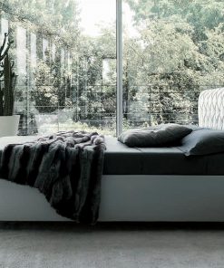 Двуспальная кровать с внутренним контейнером, с обитым основанием и обитым в технике капитоне изголовьем. Возможен вариант кровати без контейнера. Возможны другие варианты обивки и ножек.