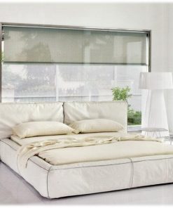 Двуспальная кровать с изголовьем, без изножья, кровать полностью обита тканью с мягким наполнением. Наполнение — полиуретан. Возможны другие варианты обивки (ткань, кожа).