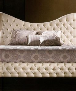 Двуспальная кровать с фигурным мягким изголовьем, без изножья. Наполнение — полиуретан. Возможны другие варианты обивки и отделки.
