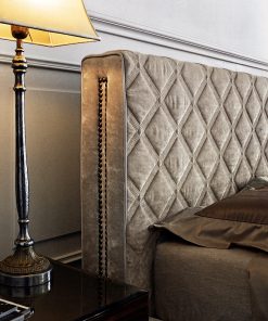 Двуспальная кровать с мягким изголовьем, декорированным ромбовидной прошивкой и металлическими заклёпками. Наполнение: полиуретан. Возможен вариант кровати с контейнером. Возможны другие варианты обивки