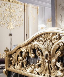 Двуспальная кровать с мягким фигурным изголовьем, обитым в технике капитоне, и фигурным изножьем. Декорирована резьбой