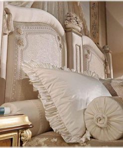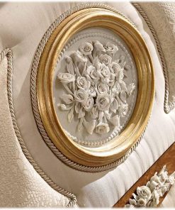 Двуспальная кровать с высоким мягким изголовьем и изножьем. Декорирована резьбой и керамическими элементами ручной работы. Возможны другие варианты обивки.