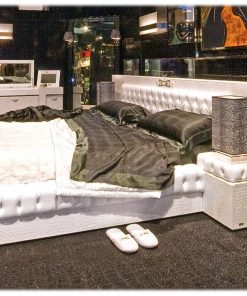 Двуспальная кровать с мягким изголовьем. В изножье выдвижные ящики, возможен вариант без них. Возможны другие варианты обивки