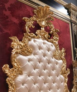 Двуспальная кровать с высоким мягким изголовьем и изножьем. Декорирована резными элементами ручной работы. Наполнение — полиуретан. Возможны другие варианты отделки и обивки.