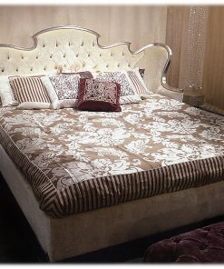 Двуспальная кровать с мягким фигурным изголовьем, обитым в технике капитоне. Наполнение — полиуретан. Возможны другие варианты обивки и отделки. В дополнение можно заказать декоративные подушки