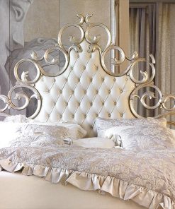 Кровать с высоким мягким изголовьем. Декорирована резными элементами. Возможны другие варианты отделки и обивки, в том числе в ткани клиента.