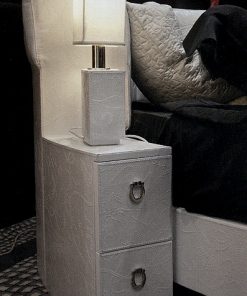 Круглая кровать с обитым изголовьем и основанием, с встроенными прикроватными тумбочками с выдвижными ящиками. Возможны другие варианты обивки.