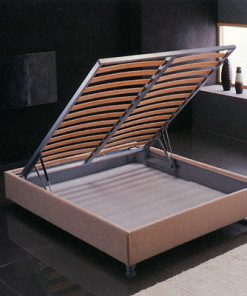 Двуспальная кровать с внутренним контейнером, без изголовья, с обитым основанием. Возможен вариант кровати без контейнера. На основании ткань, кожа и искусственная кожа съемные. Возможны другие варианты обивки.