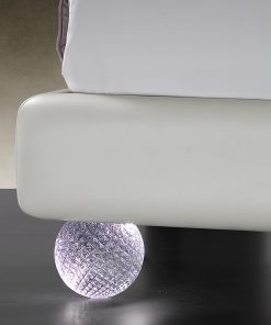 Двуспальная кровать с высоким мягким изголовьем и четырьмя круглыми ножками. Изголовье декорировано стёганой прошивкой, ножки выполнены вручную из муранского стекла. Возможны другие варианты отделки и обивки. Подсветка ножек заказывается дополнительно