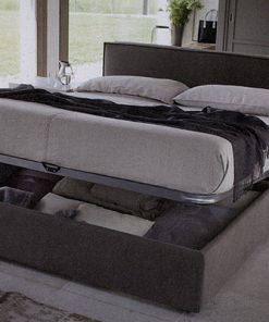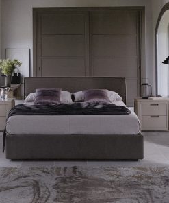 Двуспальная кровать с внутренним контейнером, с обитым изголовьем и основанием. Возможен вариант кровати без контейнера. Возможны другие варианты обивки.