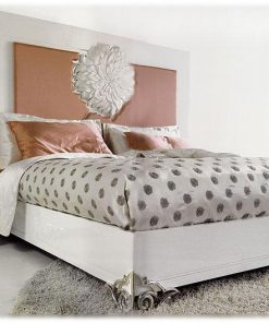 Двуспальная кровать с высоким мягким изголовьем, без изножья. Изголовье декорировано резным цветком. Возможны другие варианты отделки (различные цветовые варианты , палисандровое дерево, темный или серый дуб и т.д.).