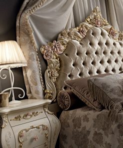 Двуспальная кровать с мягким фигурным изголовьем, обитым в технике капитоне, и фигурным изножьем. Декорирована цветочными украшениями, росписью и резьбой