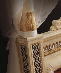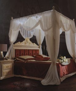 Двуспальная кровать с балдахином. Декорирована резьбой и стразами. Изголовье обито в технике капитоне. Возможны другие варианты отделки и обивки.