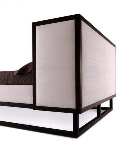 Кровать двуспальная, обитая тканью. Структура — дуб. Возможны другие варианты отделки и обивки