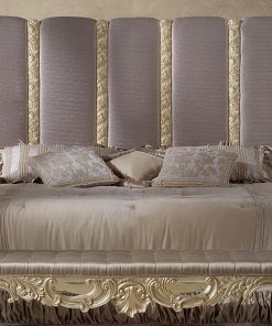 Двуспальная кровать с высоким мягким изголовьем. Декорирована резными элементами. Возможны другие варианты отделки и обивки