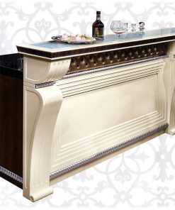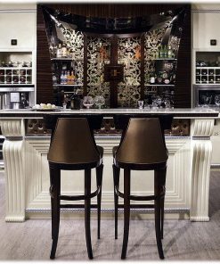 Пример композиции кухни. Столешница стойки — мрамор, стекло. Створки витрины обиты тканью. Возможны различные модификации кухни и варианты отделки — палисандр, орех, лак