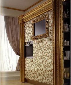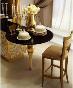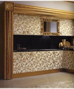 Кухня с барной стойкой в стиле арт деко, отличается обилием декоративных золотых элементов и зеркал в рамах, панели декорированы узорами, ручки инкрустированы камнями