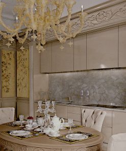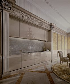 Кухня с мраморной столешницей и стенкой. Декорирована резьбой. Возможны другие варианты отделки.