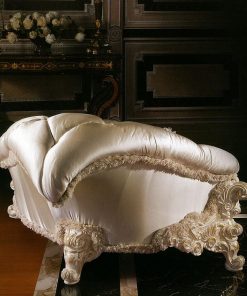 Кушетка. Наполнение — полиуретан. Декорирована резными элементами. Возможны другие варианты отделки и обивки.
