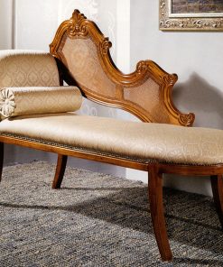 Кушетка. Декорирована резными элементами. Возможен вариант кушетки с жесткой плетеной спинкой. Наполнение — полиуретан. Возможны другие варианты отделки и обивки.