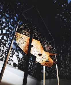 Напольная лампа с металлическим основанием и фигурным деревянным абажуром с перфорированной поверхностью