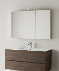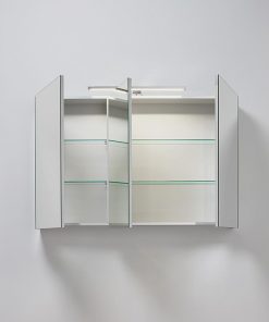 Настенный зеркальный шкаф для ванной комнаты с тремя распашными дверцами. Оснащён четырьмя стеклянными полками. В комплект входит розетка и сенсорный выключатель. Подсветка заказывается дополнительно