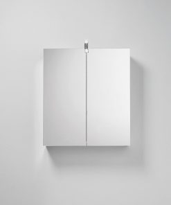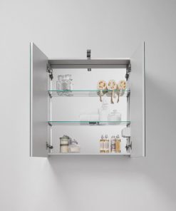 Настенный зеркальный шкаф для ванной комнаты с двумя распашными дверцами. Оснащён двумя стеклянными полками. В комплект входит розетка и сенсорный выключатель. Подсветка заказывается дополнительно