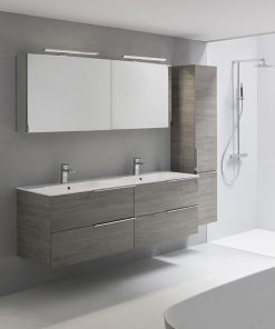 Настенный зеркальный шкаф для ванной комнаты с двумя раздвижными дверцами. В комплект входит розетка и выключатель. Подсветка заказывается дополнительно