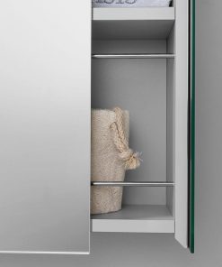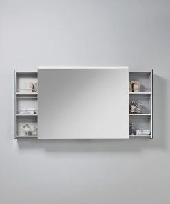 Настенный зеркальный шкаф для ванной комнаты. Оснащён двумя боковыми выдвигающимися отделениями с полками. В комплект входит розетка и выключатель. Подсветка заказывается дополнительно