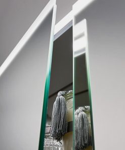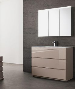 Настенный зеркальный шкаф для ванной комнаты с тремя распашными дверцами. Оснащён светодиодной подсветкой и четырьмя стеклянными полками. В комплект входит розетка и выключатель