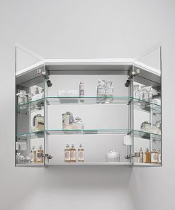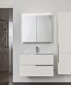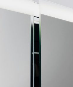 Настенный зеркальный шкаф для ванной комнаты с двумя распашными дверцами. Оснащён светодиодной подсветкой и двумя стеклянными полками. В комплект входит розетка и выключатель